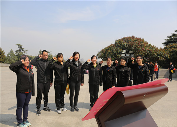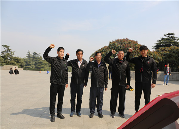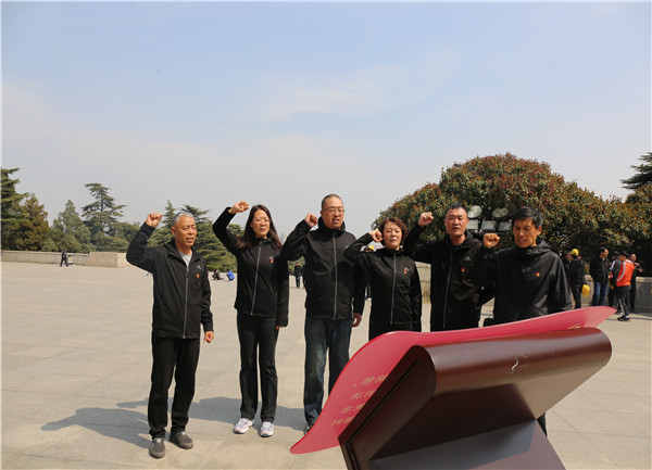 在淮海战役烈士纪念塔前,党员们重温入党誓词仪式,表达了对革命烈士的敬仰。