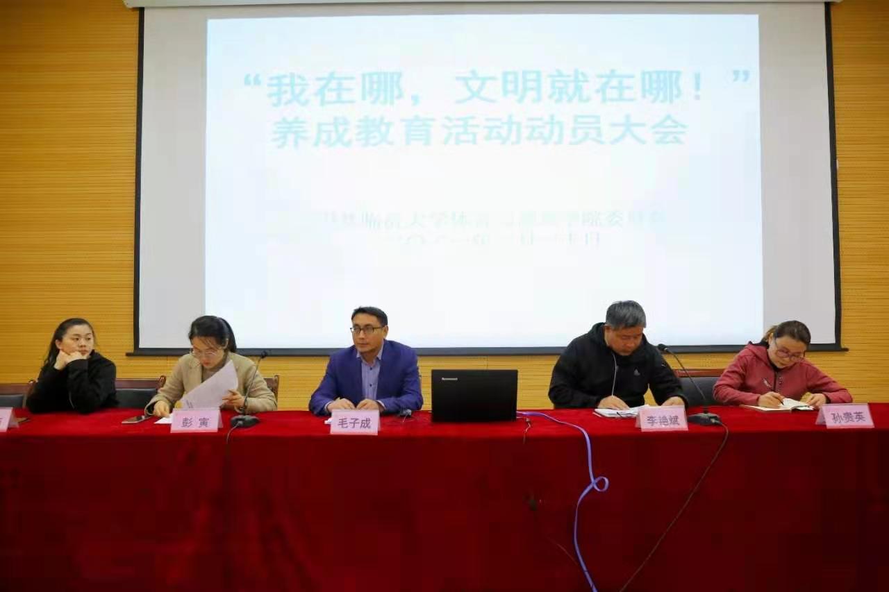 春风扶柳送暖意,绚花次第传新情。3月30日晚,我院“我在哪,文明就在哪!”养成教育活动动员大会在201举行,全体辅导员、学生会全体成员,非毕业班班长,非毕业班宿舍舍长共300余人参加。党委副书记毛子成出席并讲话,大会由学院学工办主任李艳斌主持。