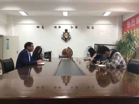4月22日上午,文学院党委副书记庞晓东、团委书记杨琦、辅导员王浩明来我院交流毕业生就业工作。学院党委副书记毛子成、毕业班辅导员孙贵英陪同座谈。