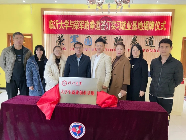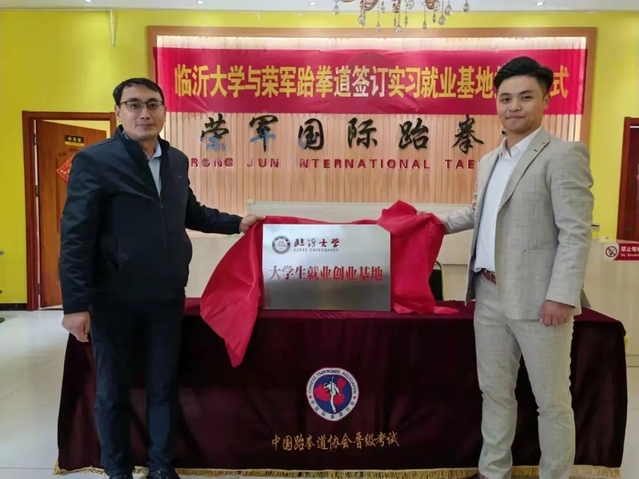 巩耒带领学院老师参观了荣军国际跆拳道训练基地,介绍了基地的发展历史、教学情况和经营状况。毛子成和巩耒代表双方签订了就业创业基地合作协议,并共同揭牌。