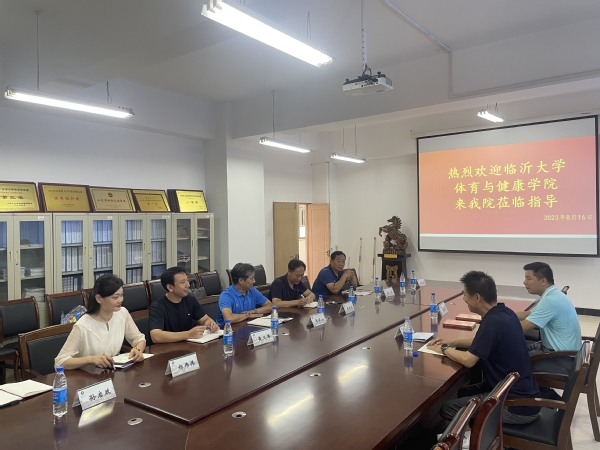 在鲁东大学体育学院会议室,与党委书记李庆山,党委副书记郭智光,科研副院长黄义军,团总支孙大海,正科级辅导员兼组织员杨伟伟进行亲切座谈交流。李书记全面介绍了学院基层党建工作经验和做法,学生考研工作措施,阳光组和专业运动队训练管理办法和取得成绩。座谈后,来宾对体育学院场馆场地进行参观。