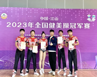 2023年11月13-20日,中国·江山2023年全国健美操冠军赛在浙江江山虎山运动公园举行。我校健美操队5名队员参加了成年精英组单人操、成年精英组三人操、成年精英组五人操三个项目,经过激烈角逐,我院21级郭浩杰、21级魏浩龙、22级贾庆超三位运动员成绩达到申请国家二级运动员的标准。