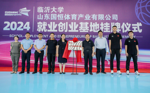 在山东国恒体育产业有限公司,谭文清一行参观了国恒体育场馆设施,举行了校企合作交流会,并为“就业创业”基地揭牌。