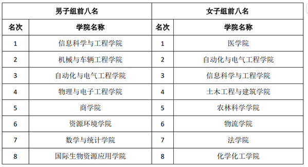 5月27日,我校第十届大学生篮球联赛圆满落幕。经过近一个月角逐,男子组比赛中,信息科学与工程学院获得冠军,机械与车辆工程学院获得亚军,自动化与电气工程学院获得季军。女子组比赛中,医学院获得冠军,自动化与电气工程学院获得亚军,信息科学与工程学院获得季军。