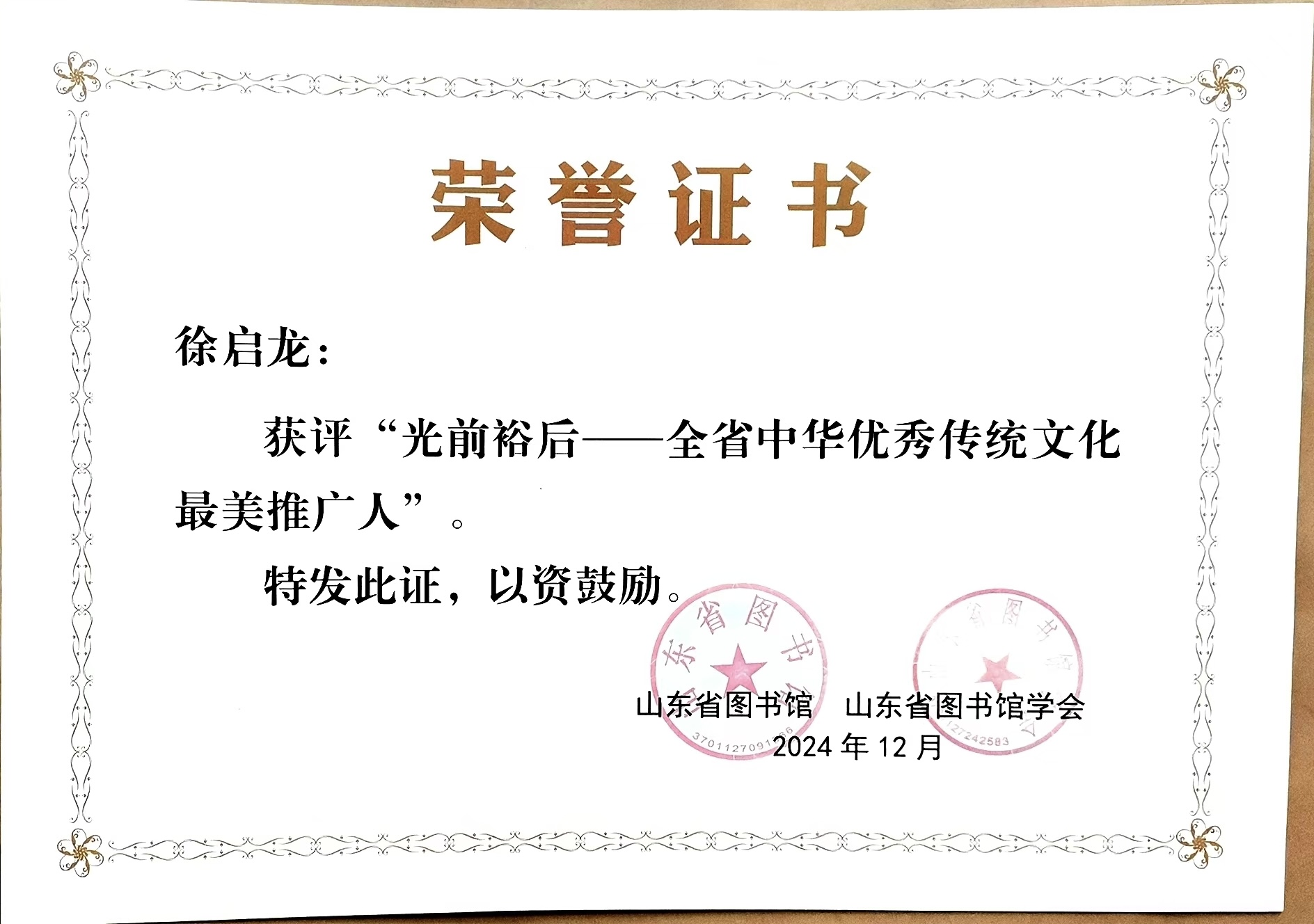 该项评选活动由山东省图书馆、山东省图书馆学会联合发起,旨在推动中华优秀传统文化创造性转化和创新性发展、加强中华优秀传统文化推广人才队伍建设。经个人自荐、单位推荐、专家评审等环节,徐启龙凭借在传承和弘扬舞龙舞狮文化方面的突出贡献成功获评。