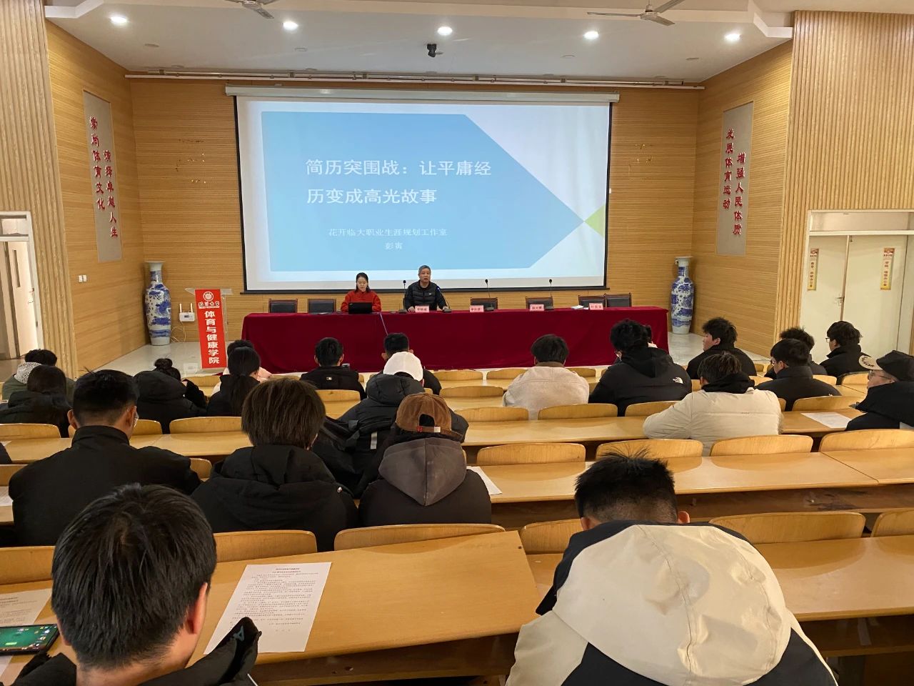2月26日,“花开临大”生涯工作室成员彭寅携《简历突围战——让平庸简历变成高光故事》,为我院160名应届毕业生揭晓用A4纸撬动offer的破局密钥。