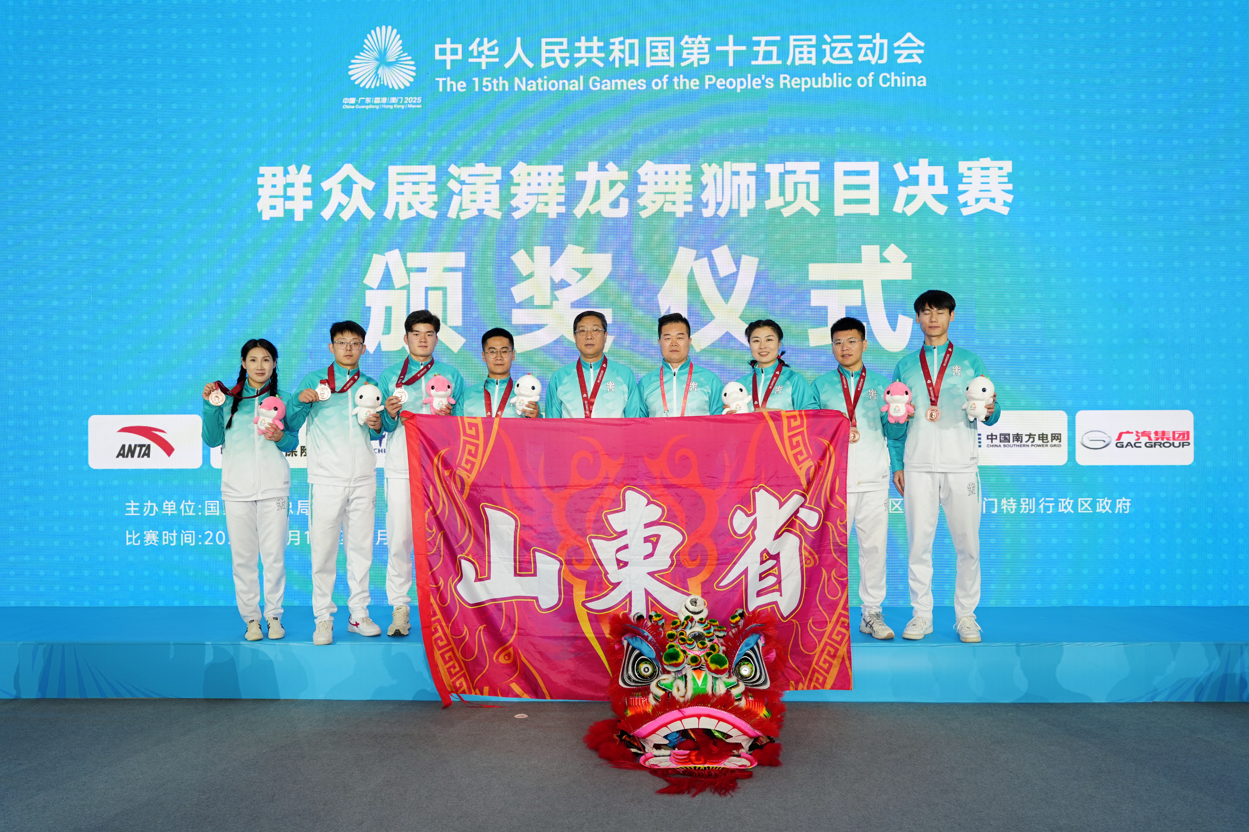 鼓声铿锵震岭南,雄狮献瑞耀全运。近日,中华人民共和国第十五届运动会群众展演舞龙舞狮项目决赛圆满落幕。我院学生陈征、王杨磊与教师贾婉萍作为山东队成员,勇夺南狮传统项目铜牌。