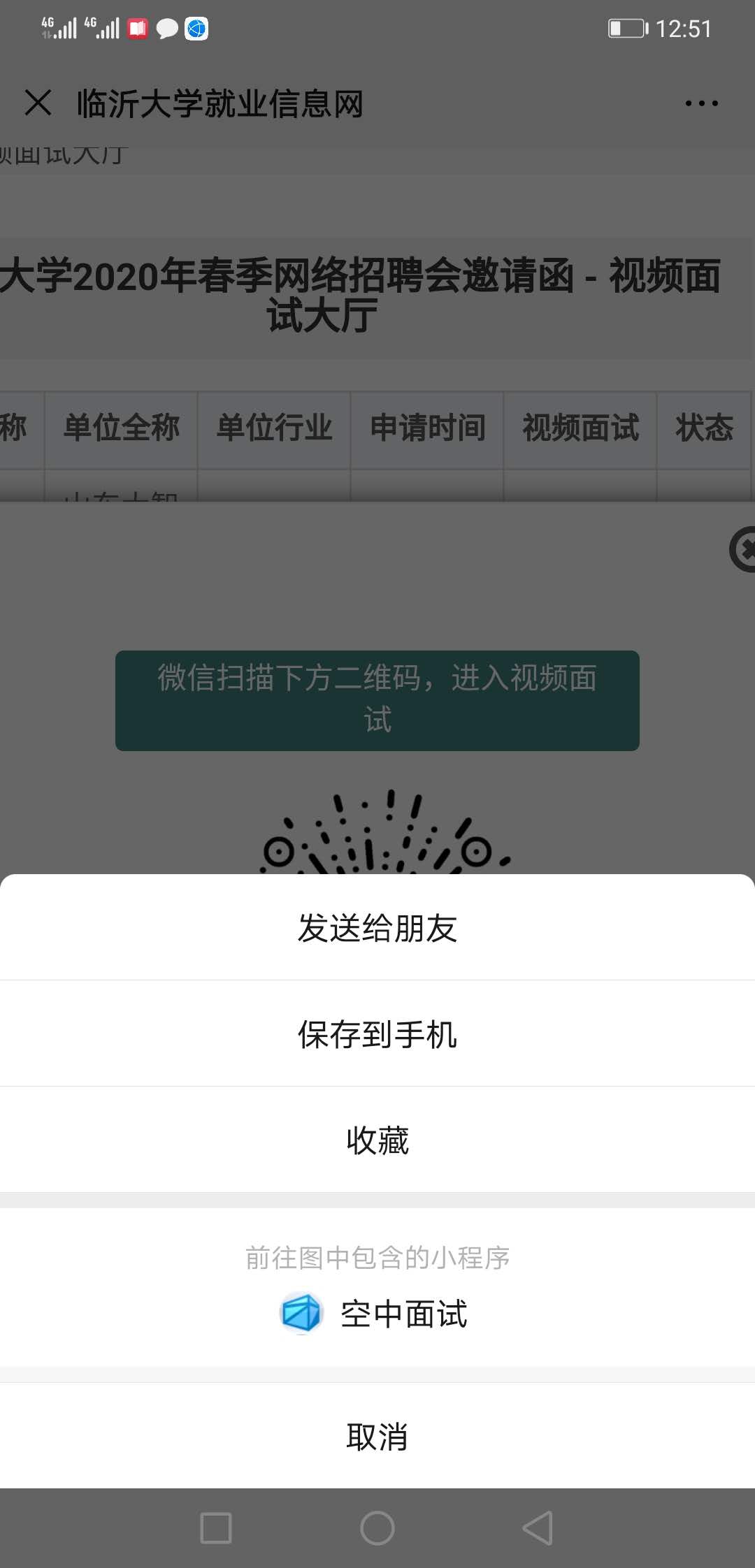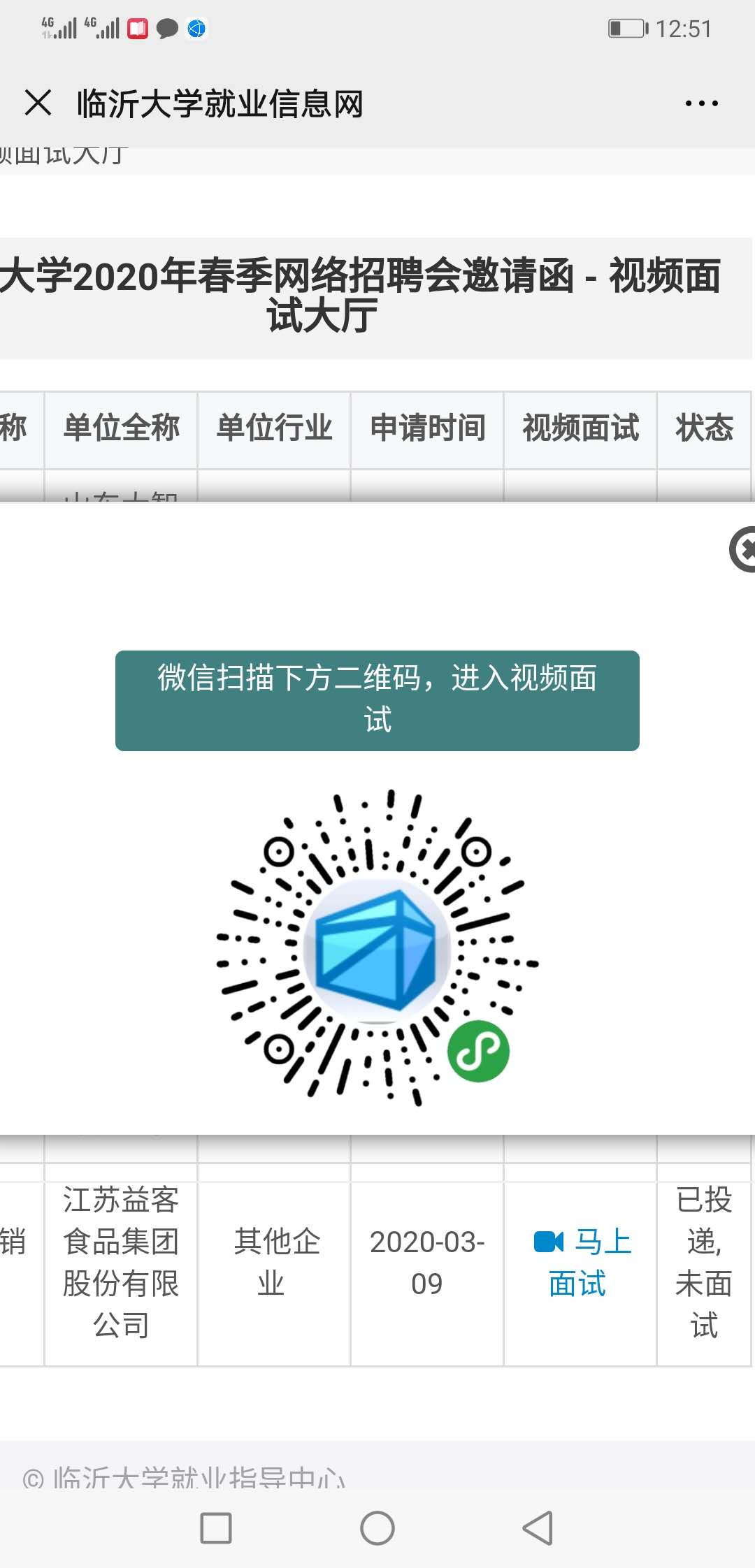 点击意向职位后面的“马上面试”,页面即弹出小程序码,用手机微信扫描视频面试小程序码进入该职位面试界面。