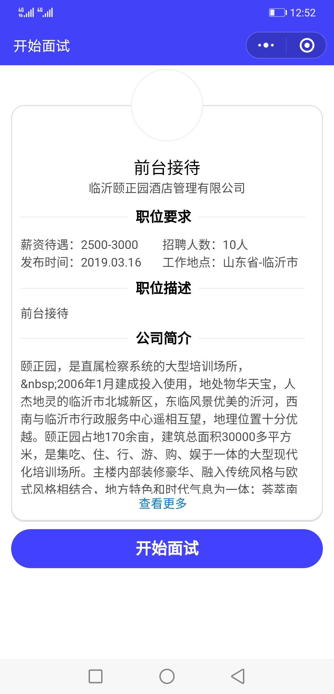 通过“招聘会”-“面试视频大厅”,找到拟录制视频的职位,点“马上面试”,系统弹出微信小程序,识别该小程序,授权,输入验证码,进入“开始面试”。