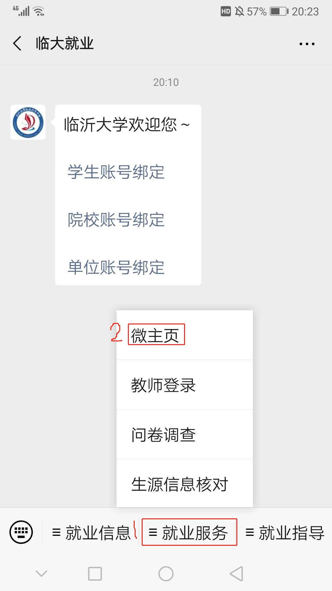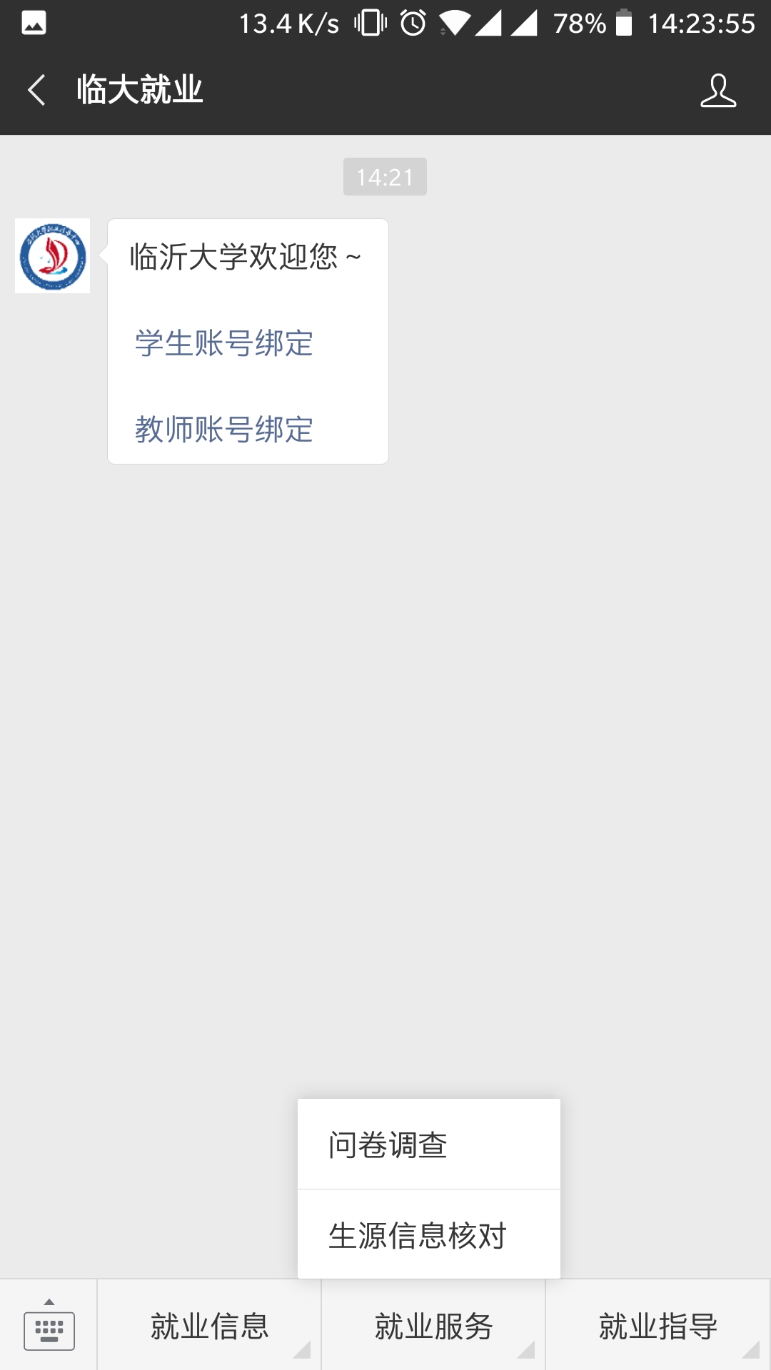 1、关注、绑定“临大就业”微信公众号,完成注册。(非师范类毕业生省略此步)