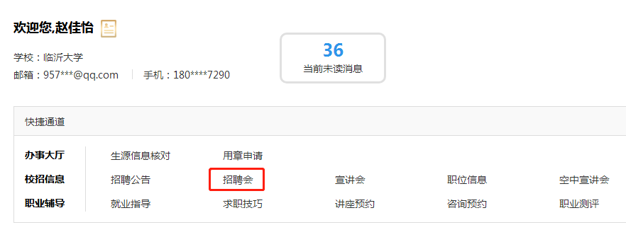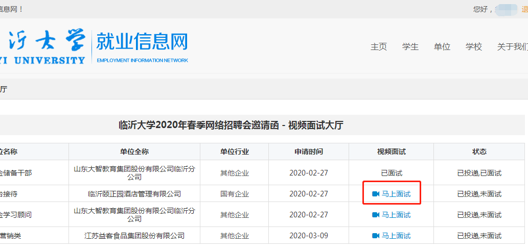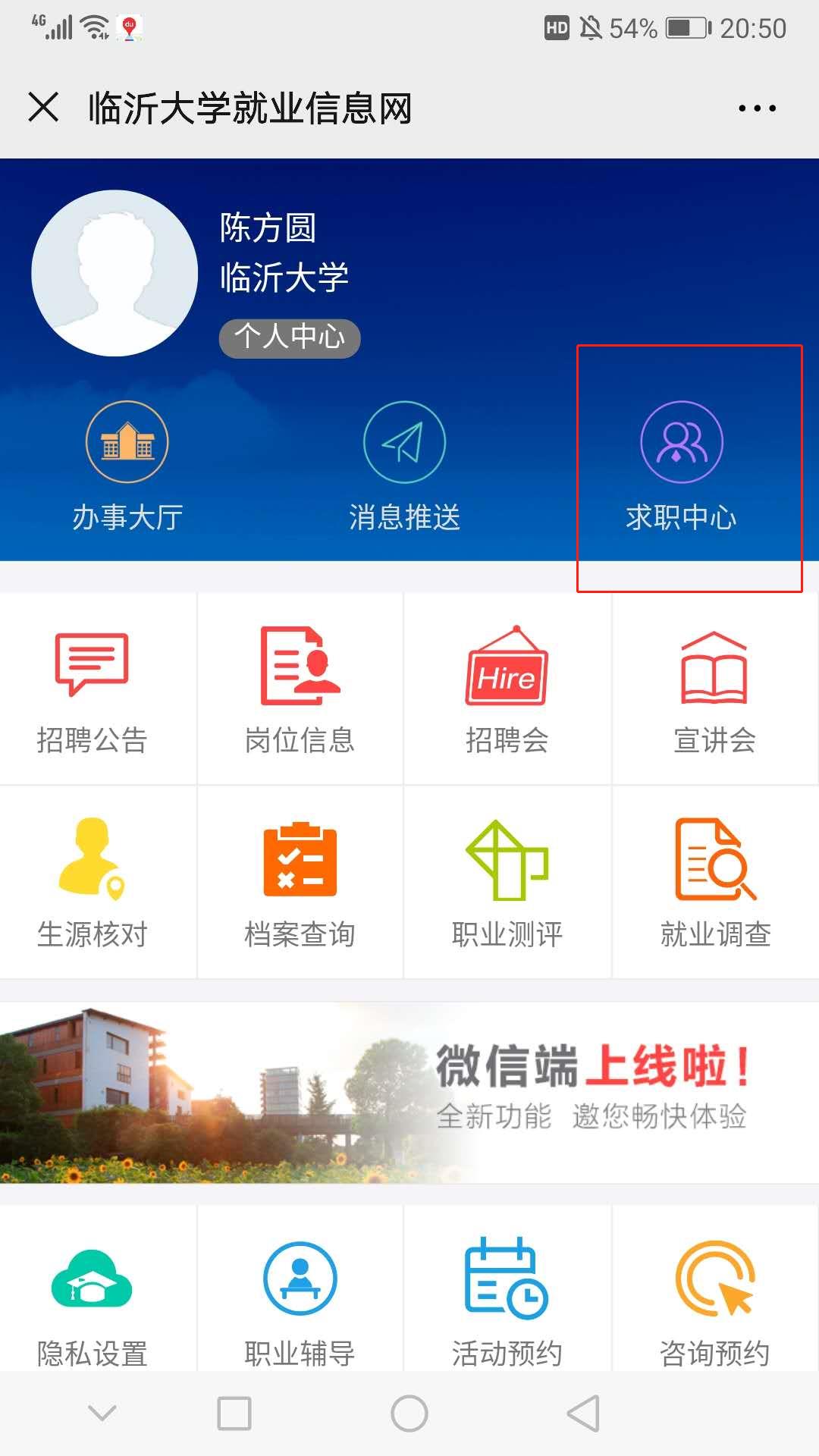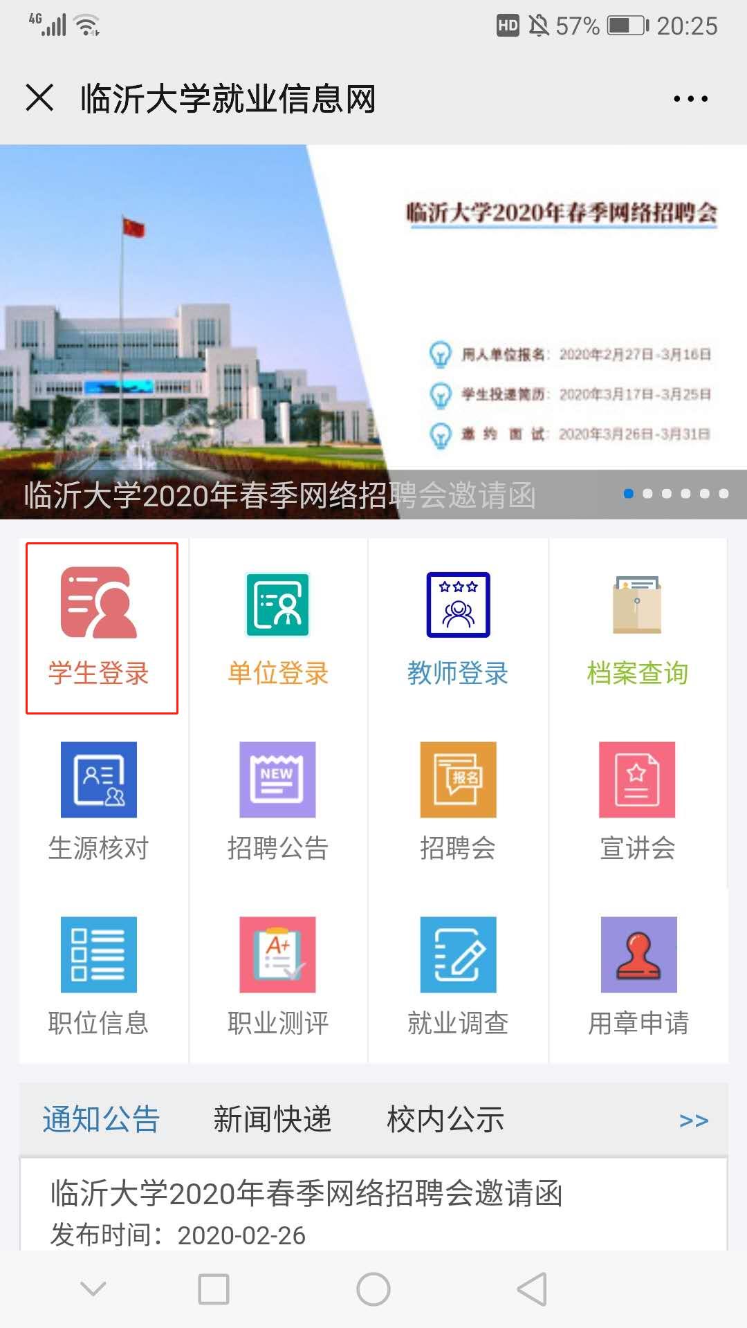 投递简历,点“招聘会”,找到“临沂大学2020年春季网络招聘会邀请函”,点击“进入会场”
