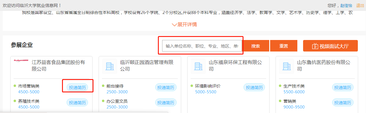 选中意向单位名称后面的“投递简历”,即完成简历投递。也可通过搜索功能查找,搜索功能在手机端没有。