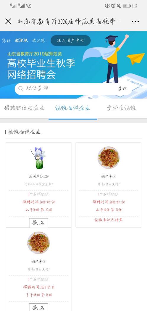 学生面试:登录“山东就业创业导航”微信平台后,查看招聘会视频面试企业(图8)。视频面试时间未开始时,学生可以报名。